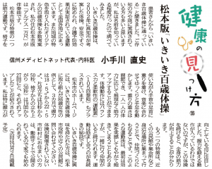 また地域の特色を取り入れたオリジナルの百歳体操も多数考案され、私の住む松本市版は「アルプス一万尺」が伴奏曲です。
