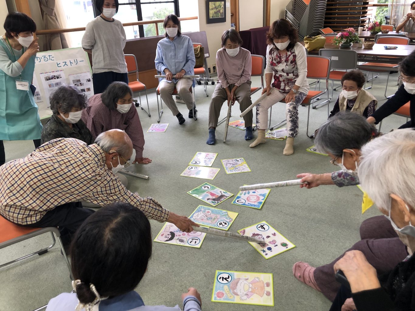 ご高齢の方など足腰をすぐに動かすことが難しい方も、椅子に座り新聞紙を丸めた長い棒などを使って、着席したままかるたを取って楽しむこともできます。