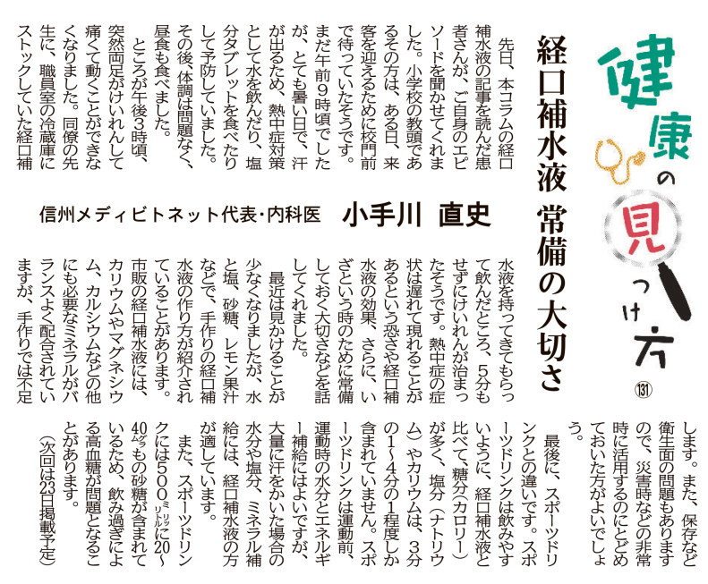 先日、本コラムの経口補水液の記事を読んだ患者さんが、ご自身のエピソードを聞かせてくれました。